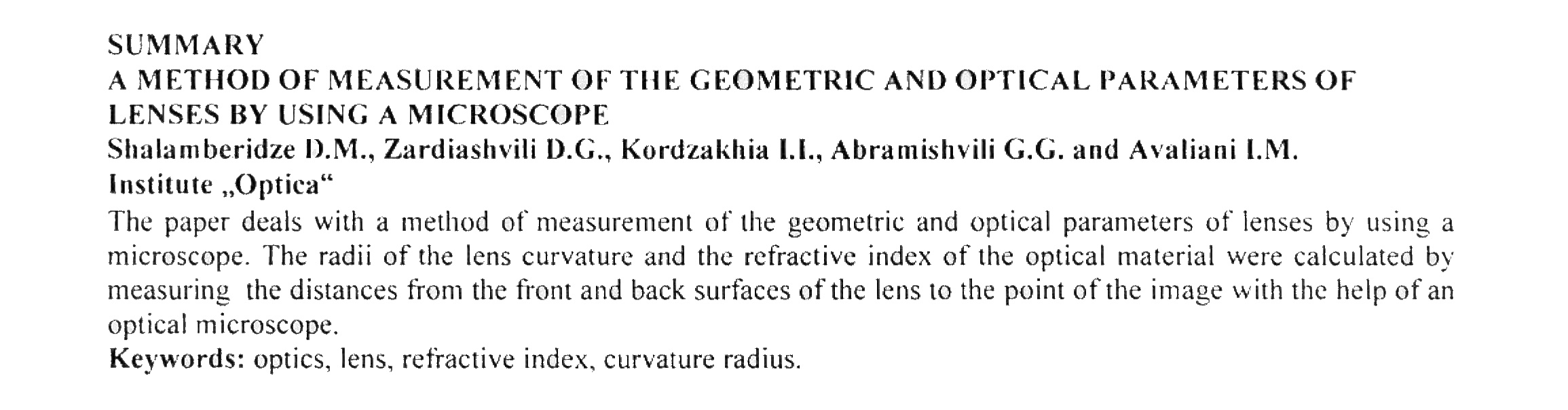 - • შალამბერიძე დ.მ., ზარდიაშვილი დ.გ., კორძახია ი.ი., აბრამიშვილი გ.გ, ავალიანი ი.მ. –ლინზის გეომეტრიული და ოპტიკური პარამეტრების მიკროსკოპით გაზომვის მეთოდი. (სტატია). საქართველოს საინჟინრო სიახლენი. №3,2014, გვ. 41- 43 გადმოწერა